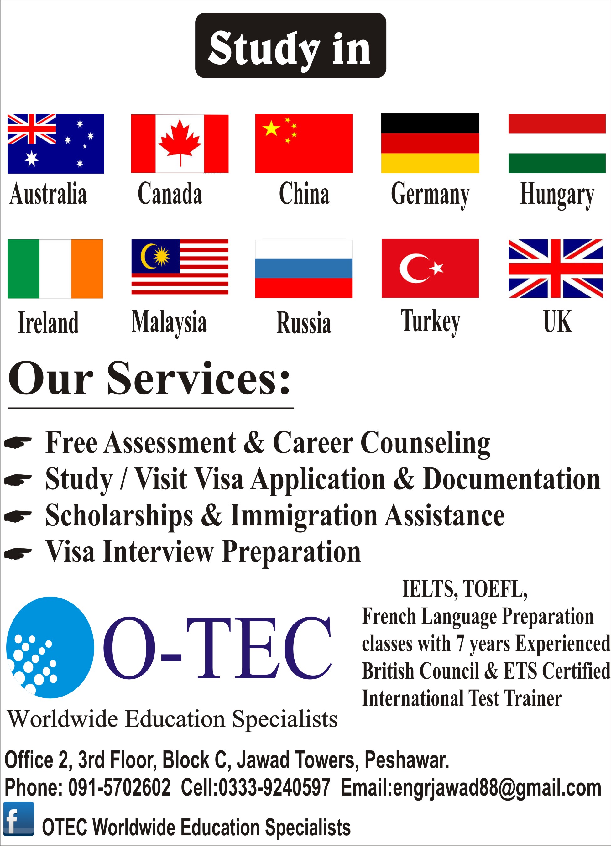 Study in Australia, Germany, Canada, UK, Ireland, Italy, South Korea, Norway, Finland, Austria, Hungary, Malaysia, Russia, Turkey, Cyprus, China. Get into the university of your dreams. Diploma, Bachelor, Master & Phd courses are available. With or Without IELTS. Bank account facility available. Upto 50% Scholarships. IELTS,TOEFL preparation classes are offered with 8 years experienced British Council, AEO & ETS certified Instructor. For detailed discussion and free guidance, kindly visit us (Monday to Saturday, 09:30 am to 07:00 pm, except prayer break) with your documents at O-TEC Worldwide Education Specialists, Office 2, 3rd Floor, Block C, Jawad Towers, University Road, Peshawar or call us at 091-5702602, 0333-9240597.   Find us on facebook as OTEC Worldwide Education Specialists